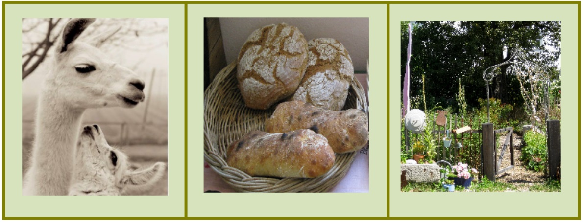 Eigene Produkte: frische Fladenbrote aus dem Holzbackofen, Käse aus hofeigener Milch, Butter und diverse Brotaufstriche, Obst und Gemüse der Saison aus dem Bauerngarten bzw. aus der Region, frische Kräuter, Apfelsaft aus hofeigenen Äpfeln und natürliche frische Milch