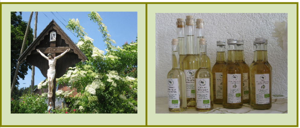 Produkte: Holunderblütenlimo, Hugo nach Absprache, Holunderschmankerl, Verkauf von hofeigenen Bio-Holunderprodukten